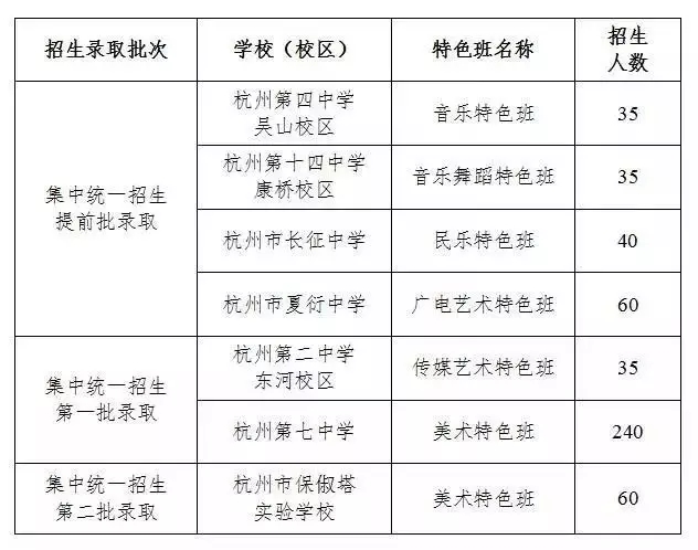 3.考核程序:考生先报名参加招生学校组织的术科测试,成绩合格考生即视作完成提前批特色班志愿填报,参加杭州市区初中毕业升学考试后,列入集中统一招生提前批录取。